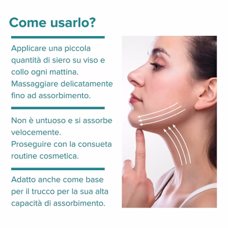 Applicare una piccola quantità di siero sul volto pulito sia mattina che sera e massaggiare delicatamente fino al completo assorbimento. Il siero non è untuoso e si assorbe velocemente.